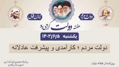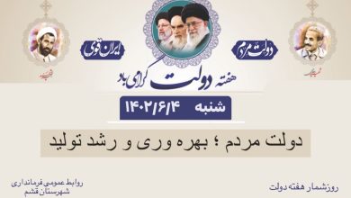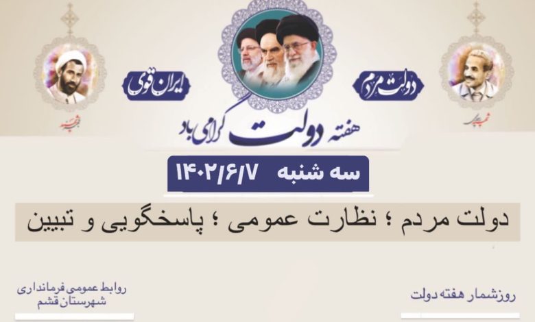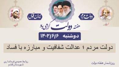 به گزارش روابط عمومی فرمانداری شهرستان قشم، شعار هفته دولت امسال، «دولت مردم» انتخاب شده و در نام گذاری ایام هفته دولت، رویکردها و برنامه های اصلی موردتوجه قرار گرفته است.