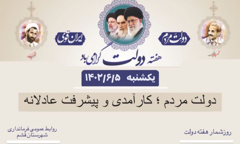 به گزارش روابط عمومی فرمانداری شهرستان قشم، شعار هفته دولت امسال، «دولت مردم» انتخاب شده و در نام گذاری ایام هفته دولت، رویکردها و برنامه های اصلی موردتوجه قرار گرفته است.