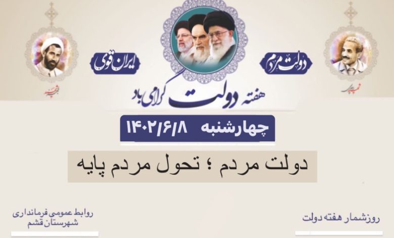 به گزارش روابط عمومی فرمانداری شهرستان قشم، شعار هفته دولت امسال، «دولت مردم» انتخاب شده و در نام گذاری ایام هفته دولت، رویکردها و برنامه های اصلی موردتوجه قرار گرفته است.