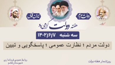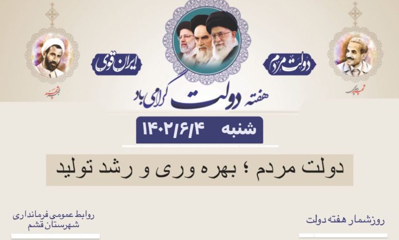 به گزارش روابط عمومی فرمانداری شهرستان قشم، شعار هفته دولت امسال، «دولت مردم» انتخاب شده و در نام گذاری ایام هفته دولت، رویکردها و برنامه های اصلی موردتوجه قرار گرفته است.